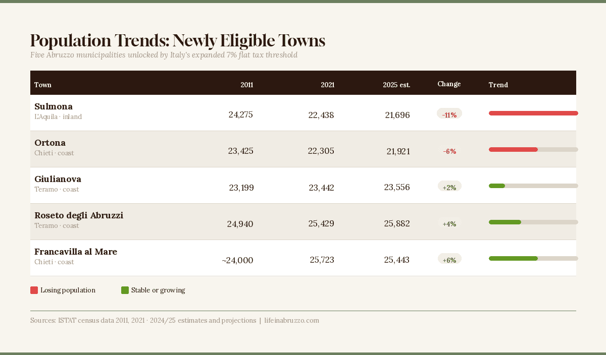 It is important to see what is really happening in these five towns. The situation is not the same everywhere. Sulmona has lost about 11% of its population since 2011, dropping from 24,275 to around 21,600. Ortona has lost about 6% in the same period. These towns are truly losing people. On the other hand, Giulianova, Roseto degli Abruzzi, and Francavilla al Mare are stable or even growing a little, mostly because they are coastal towns near Pescara. They do not face the same depopulation issues. Still, the tax break applies to all five towns, whether or not they need more residents. Understanding this gives useful context before choosing where to move.