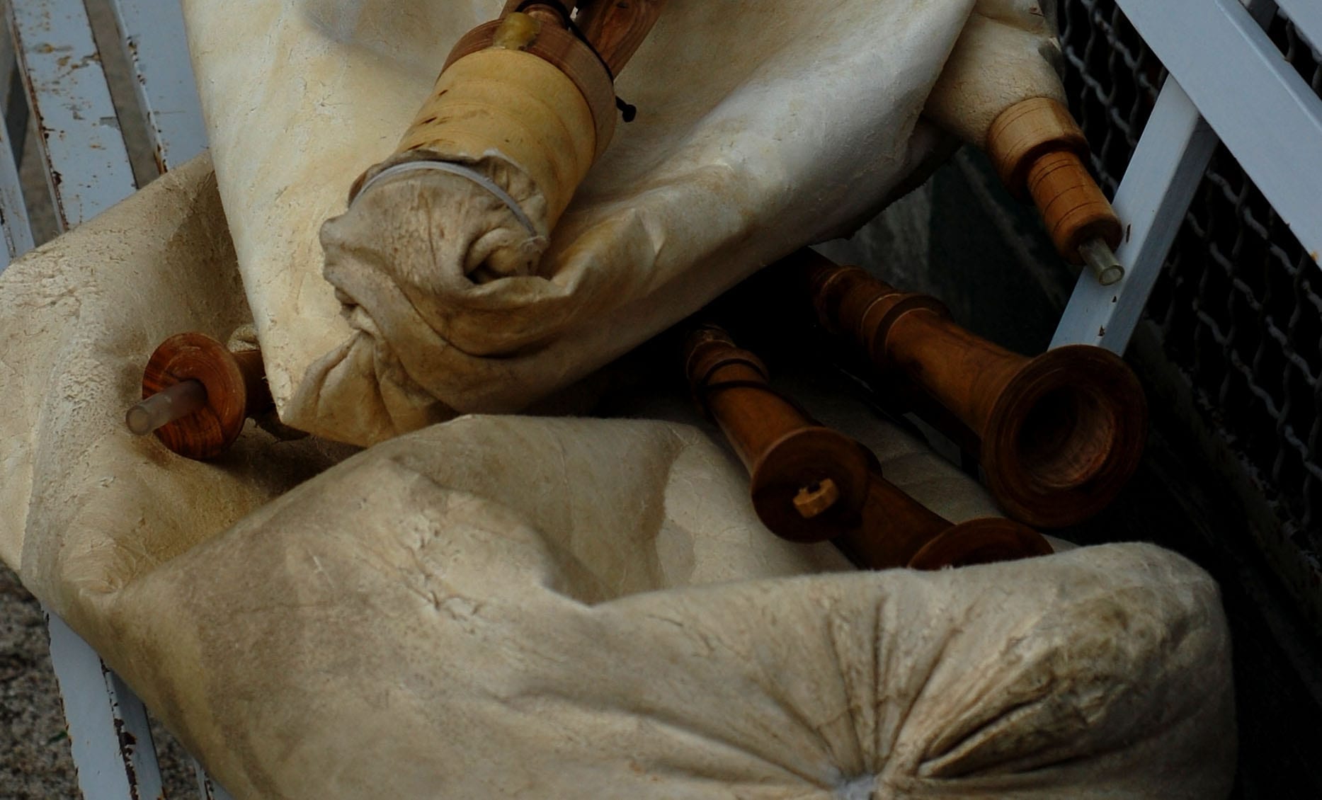 If you notice that these pipes look more animal-like than the Scottish ones, it’s because the Zamognaro cures the goat or sheep hide in one piece, then turns it inside out so the hair stays inside the bag (the otre), which is tied at the front of the rear legs. One front leg holds the blow pipe, while the other is tied off. The chanters or drones are attached to the neck of the skin.